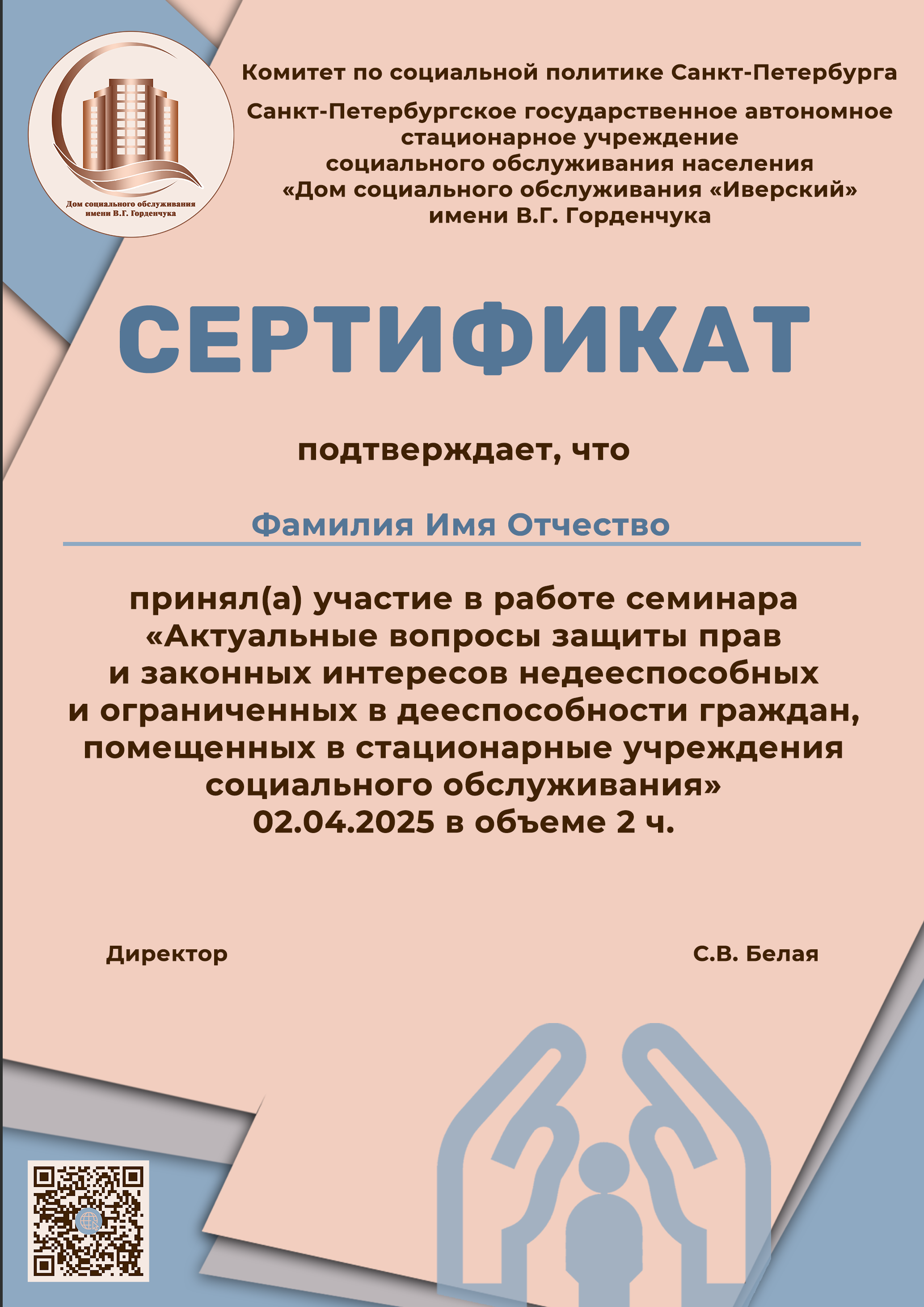 Белая Светлана Владимировна – директор Санкт-Петербургского государственного автономного стационарного учреждения социального обслуживания населения «Дом социального обслуживания» имени В.Г. Горденчука